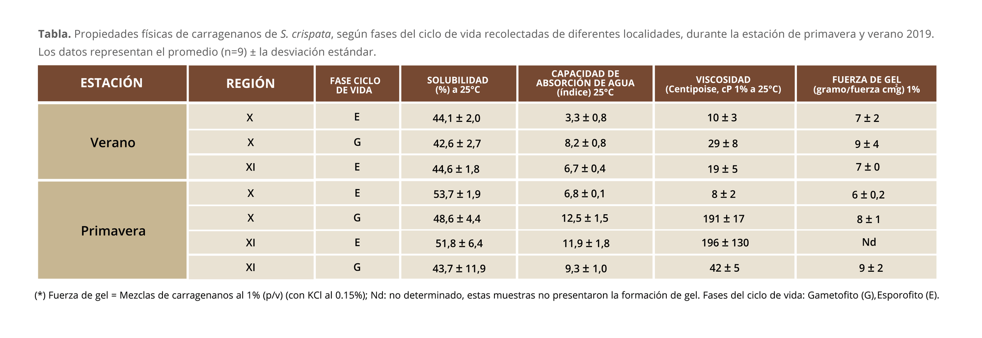 Las variaciones en la composición química de los diferentes tipos de carragenanos influyen en sus propiedades fisicoquímicas. Por ejemplo, un mayor porcentaje de grupos sulfatos reduce la temperatura de solubilidad del carragenano y produce una menor fuerza del gel.